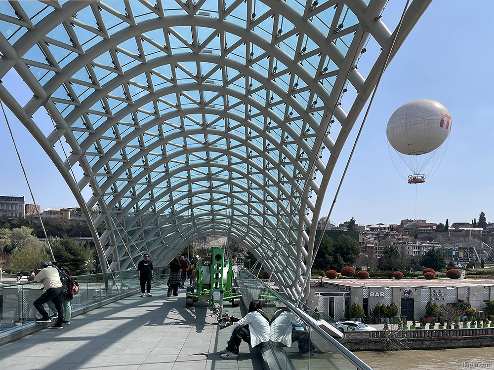 - The Bridge of Peace and an air balloon hovering thoughtfully at a moderate altitude.