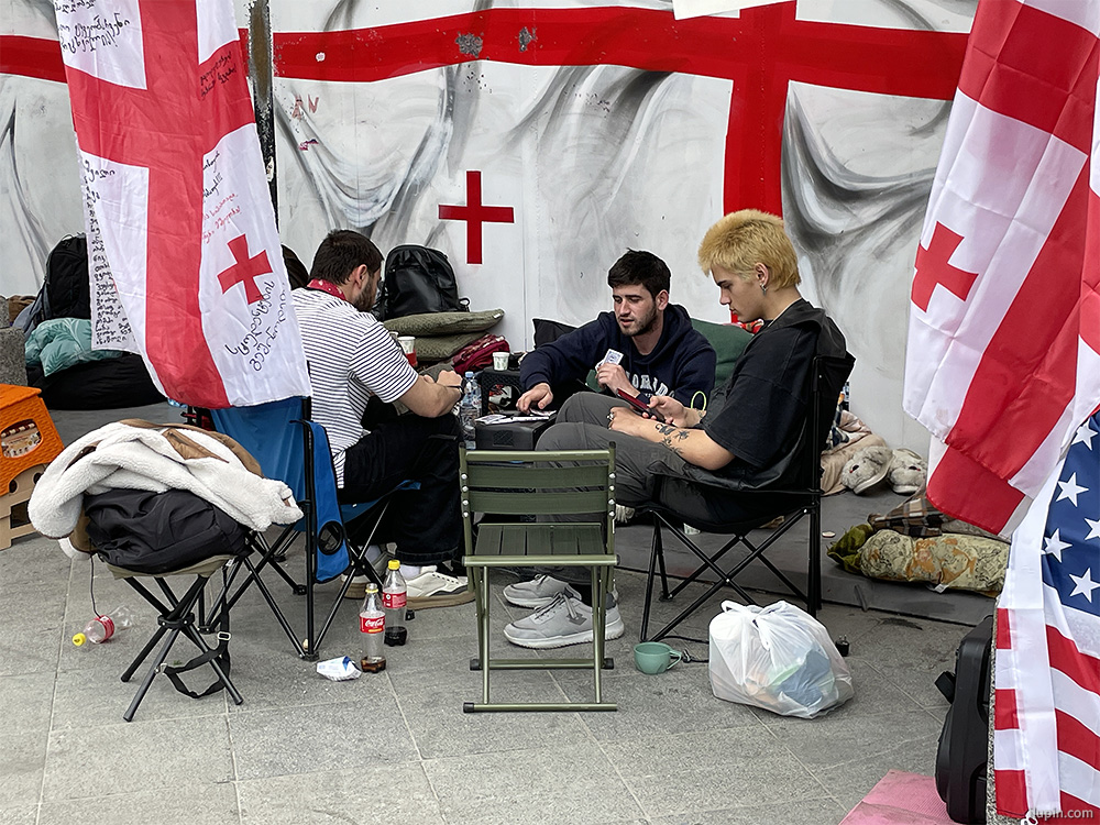 - Young rebels on the steps of the Parliament prepare for a long siege.