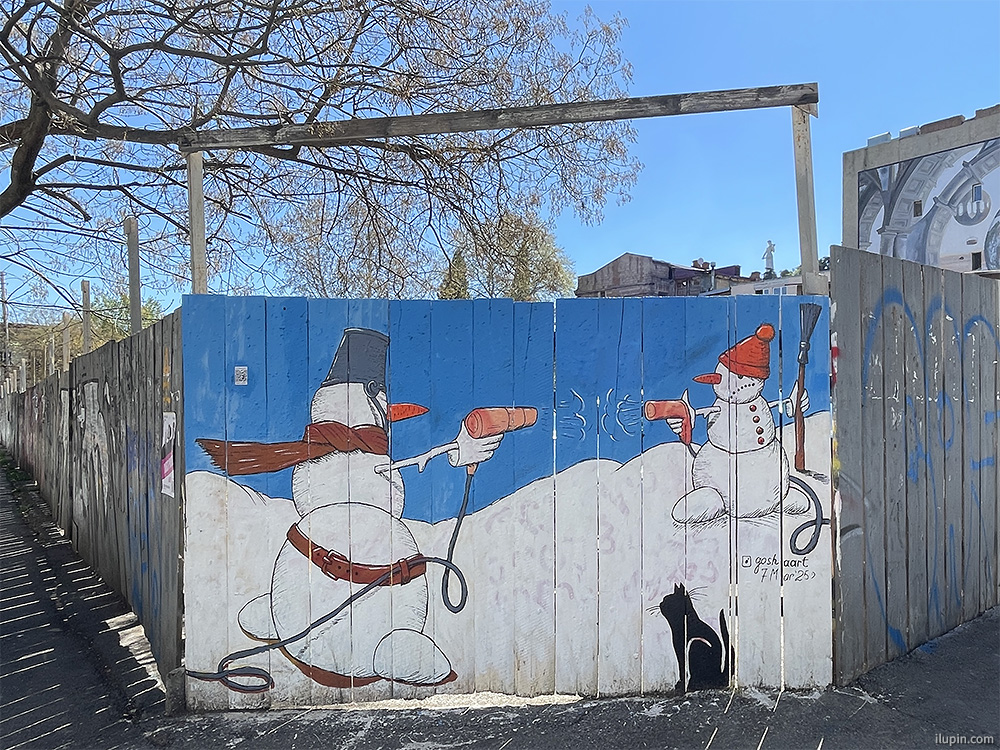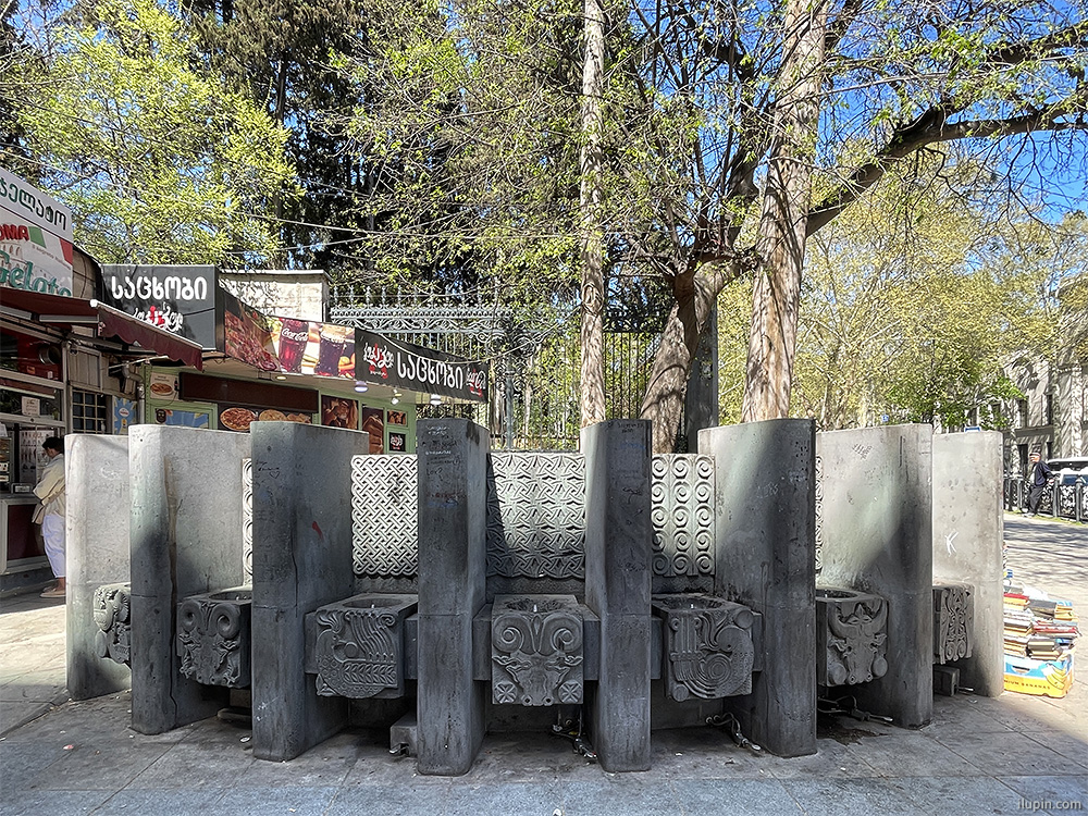 11. Drinking fountains in the spirit of Soviet urbanism with traditional motifs near street booksellers.